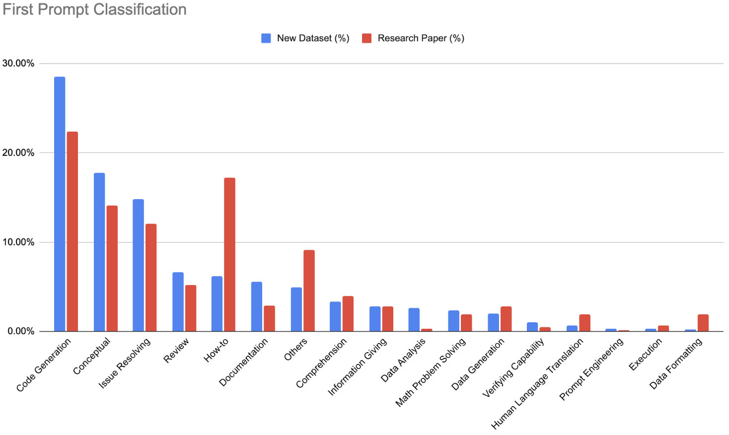 Our analysis categorized developers' initial prompts into 16 types, highlighting Code Generation as the most frequent (28.5%), followed by Conceptual inquiries (17.8%) and Issue Resolving (14.8%). This indicates a high demand for code assistance and theoretical understanding. Additionally, our study identified patterns within code generation requests, with Feature Implementation and Integration as dominant subcategories, suggesting that developers frequently turn to ChatGPT for code that integrates smoothly into existing workflows. In the realm of issue resolution, prompts were often aimed at troubleshooting specific code errors and understanding why certain implementations failed. These findings emphasize ChatGPT’s primary role in helping developers with code generation, technical clarification, and debugging in software projects.