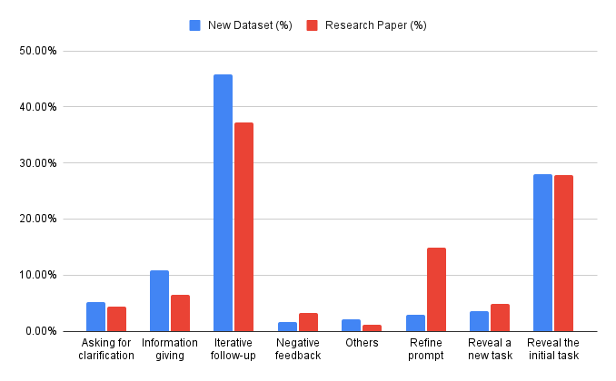 Multi-turn conversations offer developers the opportunity for iterative refinement and clarification. Our findings reveal that Iterative Follow-up is the most common pattern in multi-turn interactions (45.78%), as developers often refine their initial prompts or build on ChatGPT’s responses to address complex challenges. Information Giving (10.87%) and Asking for Clarification (5.22%) were also prevalent, with developers providing additional context or seeking deeper understanding of ChatGPT's responses. This highlights ChatGPT's value not just as a static answer provider but as an interactive tool for refining and developing solutions through back-and-forth dialogue. The high frequency of follow-ups reflects a strong preference among developers for using ChatGPT as a collaborative partner in resolving intricate technical issues.